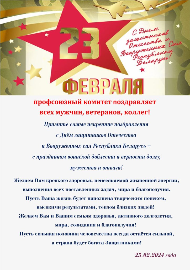 By 23.02.2024 Поздравления 0 Comment Профсоюзный комитет поздравляет всех мужчин, ветеранов, коллег с 23 февраля!